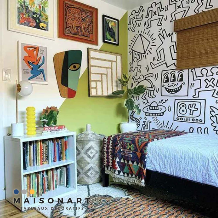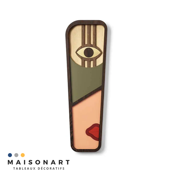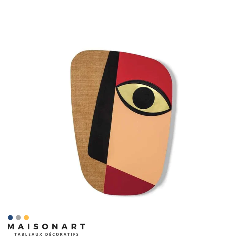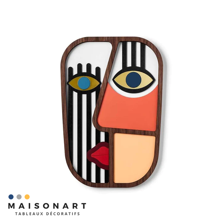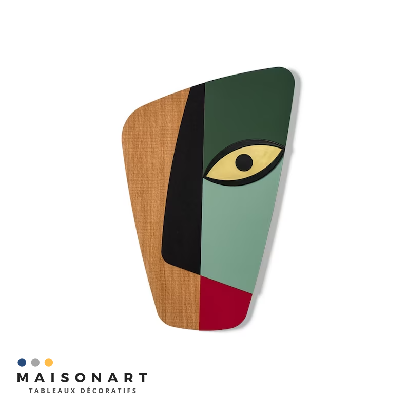 Un masque en bois décoratif fait main inspiré de Picasso, du cubisme, des formes et des contours.