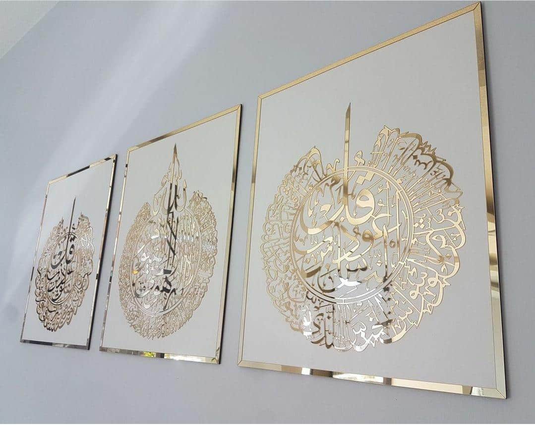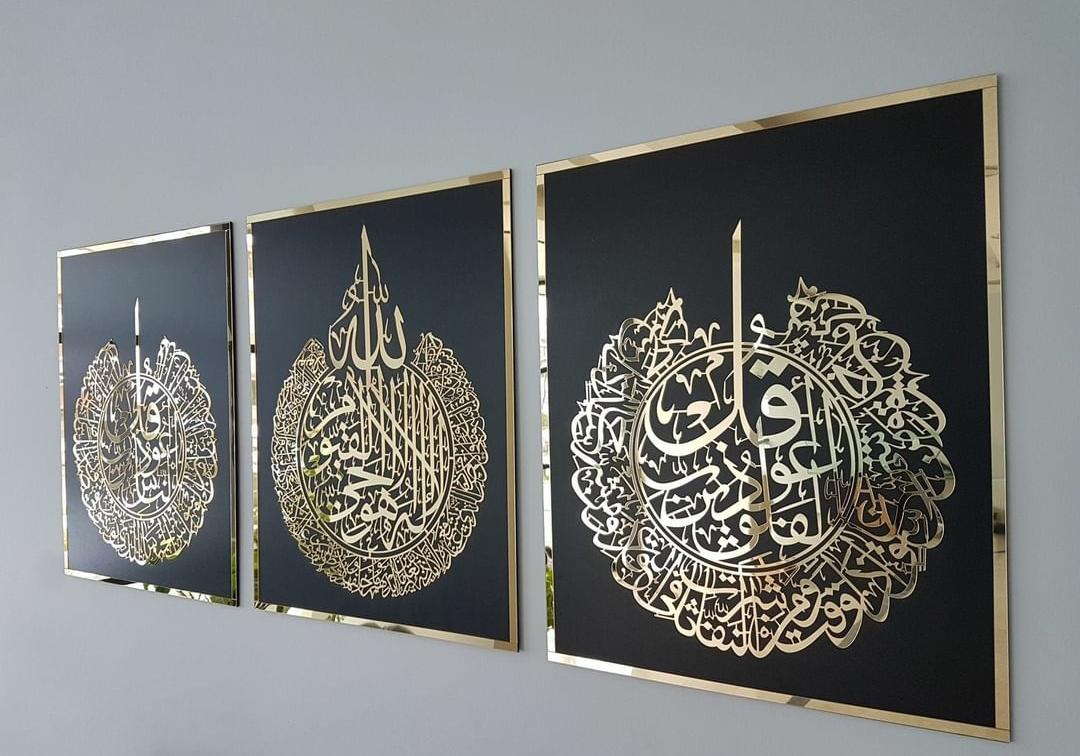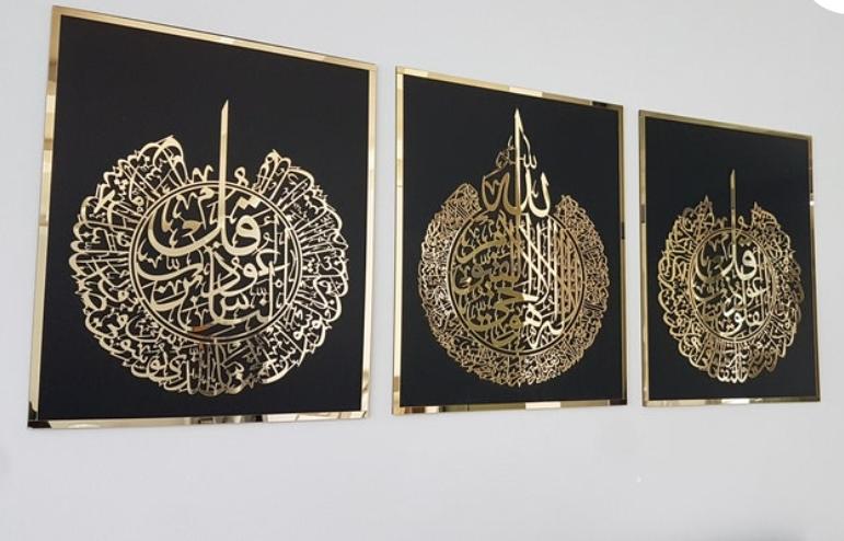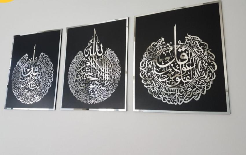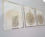 Tableau avec versets du Coran en forme reliefs 3D base en bois MDF et personnalisation en PMMA effet miroir, livré en 3 parties avec crochets de fixation sur le mur, la surface rigide et brillante permet un nettoyage facile et rapide sans avoir soucis des petit détails de texte (Dimensions totale : 1,20m x 0,60m).